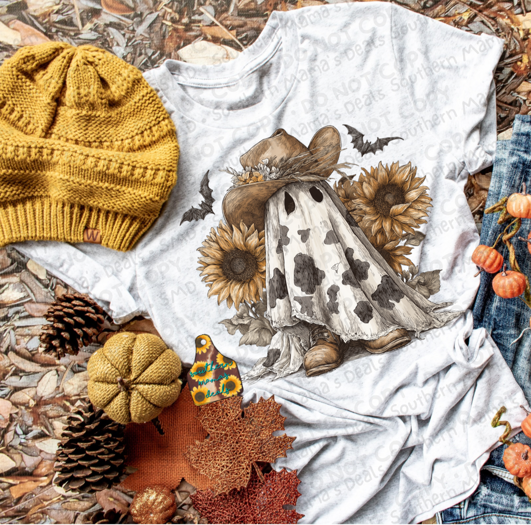 Super cute Sunflower Cowboy Ghost on an ash grey tee!